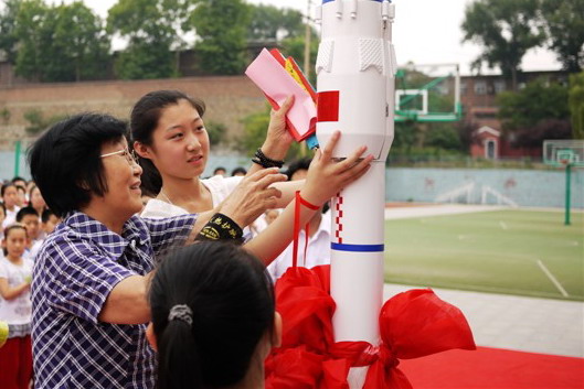 全体同学在齐唱校歌《少年责任重》、齐诵青春誓言后,将写给“2022年自己”的一封信封存至学校特意从酒泉卫星发射中心定做的“长征二号”火箭模型中,并且相约2022年再次相聚母校,验证自己的梦想。随后,出席活动的各位领导、家长一起书写了自己的祝福与希望,并与孩子们一起将其折成纸飞机,在陪伴2011级的孩子们经过象征着“告别童年”的“少年门”后,一起放飞了象征着“理想与希望”的纸飞机。