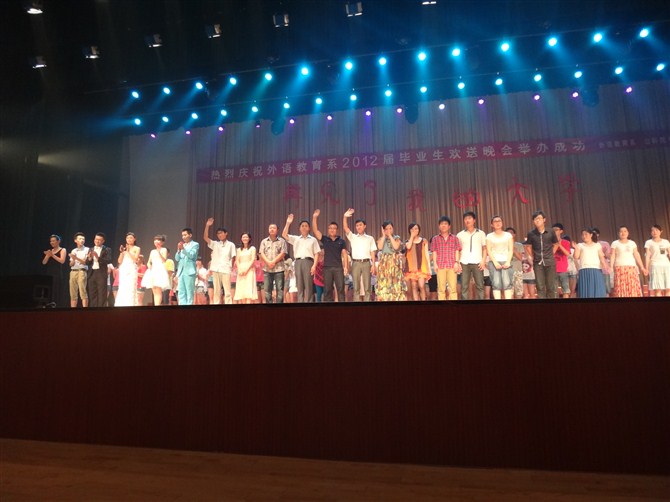 在外语系毕业班任课老师《相亲相爱》的歌声中,欢送晚会盛大开场。三年前的夏天,是在这里,我们一身戎装,满怀憧憬,开始编织起多彩的梦想;三年中,我们有过艰辛的付出,有过伤心的泪水,更有过成功的欢笑;三年后的今天,也是在这里,我们并肩而坐,充满留恋,即将开始人生新的征程。系学生会全体成员的歌曲《那些年》、09级10班的情景剧《六月的告白》,深情回顾了美好的大学生活,道出了大家面临毕业时的复杂心情。歌舞、小品、诗朗诵、T台模特秀等节目,高潮迭起,异彩纷呈。系领导在晚会现场向即将毕业的同学表达了外语教育系全体师生的殷切期望和真诚祝福。晚会在《相亲相爱一家人》歌声中结束。老师同学们久久不愿离去,依依惜别。