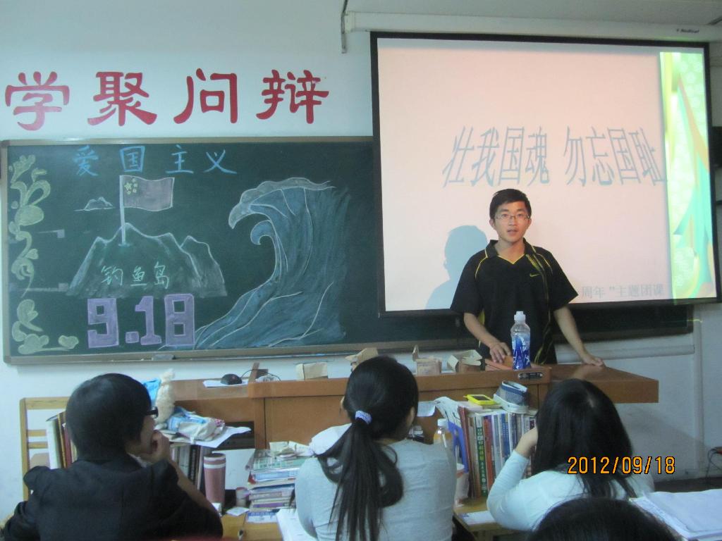 为了更好的指导学生辩证的看待历史,理性的担负社会责任。2012年9月18日星期二晚7:00,在人文系团总支的号召下人文系11级各班开展了以“铭记‘九一八’” 为主题的团课活动。