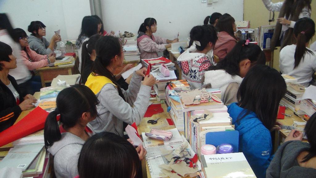 2012年10月23日星期二, 有人文科学系团总支组织学生在2012级语教5班教师开展了了中国红剪纸活动,并邀请了手之韵剪纸社团社员为同学们作了指导。