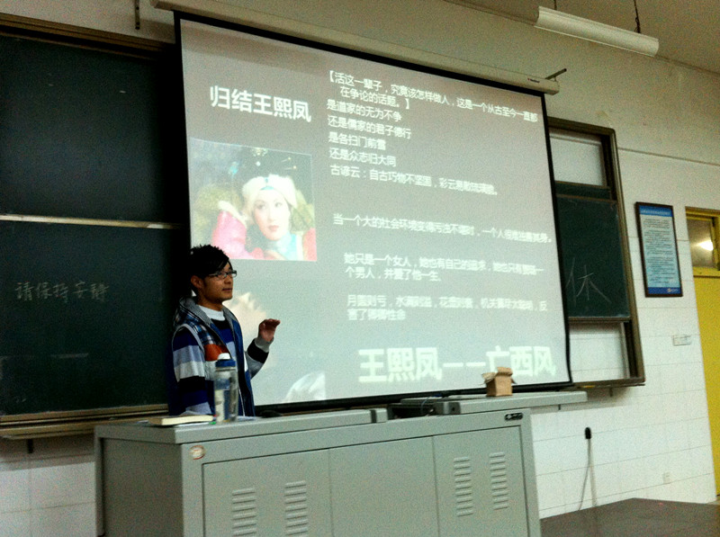 2012年11月18日晚七点,人文讲坛第32期在阶梯教室六如期开讲。本次主讲人为12级语教4班的王季同学,他为大家带来了以“红楼绝冠——戏说王熙凤”为题的精彩讲说。