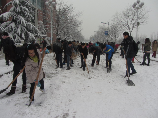 2012年12月21日上午两节课后,由人文科学系团总支组织全体学生干部进行了一场热火朝天的道路积雪清理活动。