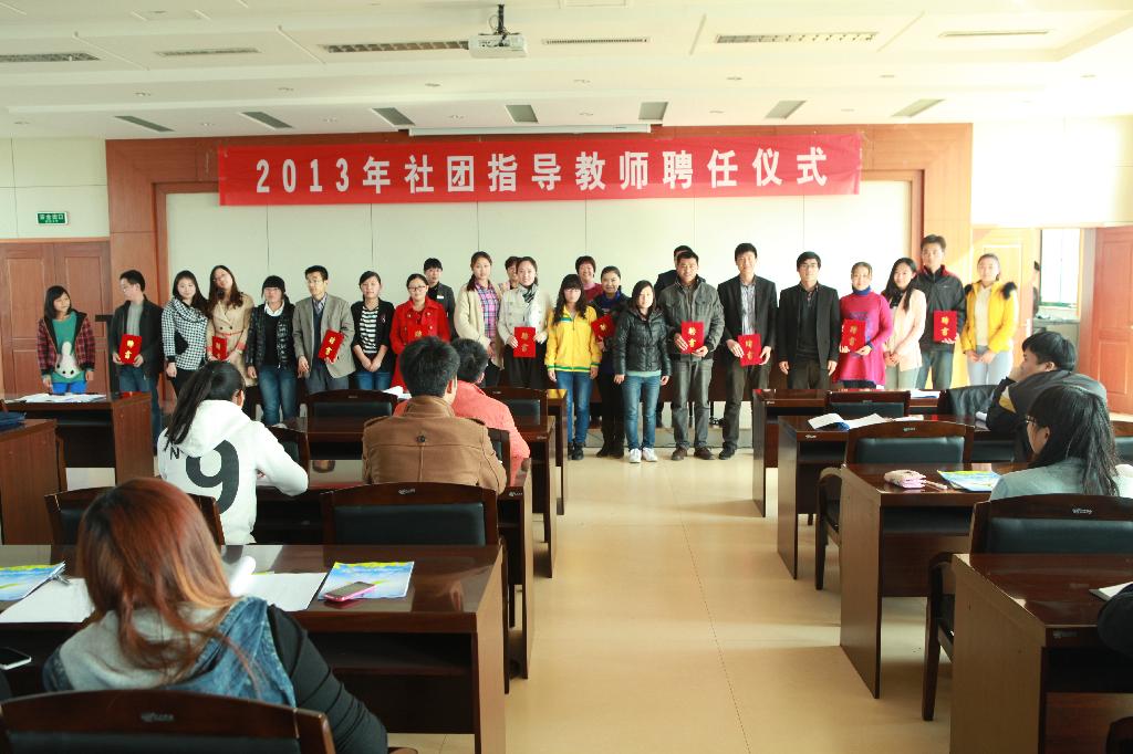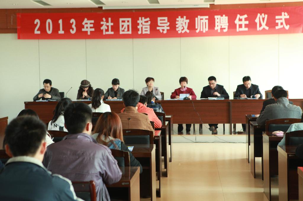 聘任仪式由团委书记刘晓莉主持。刘书记首先简要回顾了过去一年社团工作取得的成绩,同时通报了2013年社团指导教师聘任情况。社团指导教师代表常青、张明成分别对所带社团工作开展情况及取得的成效作了简要介绍;对社团活动对学生专业素养提升、健全人格培养等发表了自己的观点和认识。大学生心理协会会长李彩、深蓝口语社社长于茜作为学生社团代表分别就参与社团工作对自身全面发展、人际关系改善、技能培养以及学习、生活的充实等方面的重要意义作了典型发言。