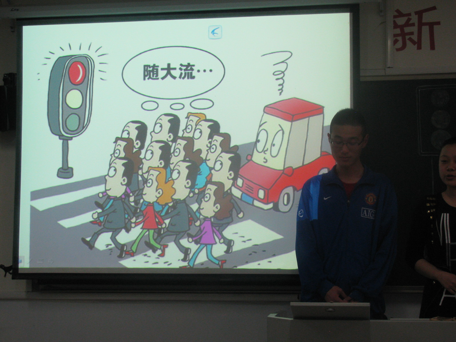 活动主要围绕着从“中国式过马路”中发现的问题进行了深层次的剖析。同学们用多种新颖的形式进行了阐释:图文并茂的PPT,有犀利直观的视频观摩,从路人的反应中了解国民素质情况;模拟采访,为同学们直言对此事的态度提供了良好的平台;幽默诙谐的小品,轻松愉快却发人深省的打油诗和三句半多种形式从各个方面对“中国式过马路”进行了剖析和挖掘。