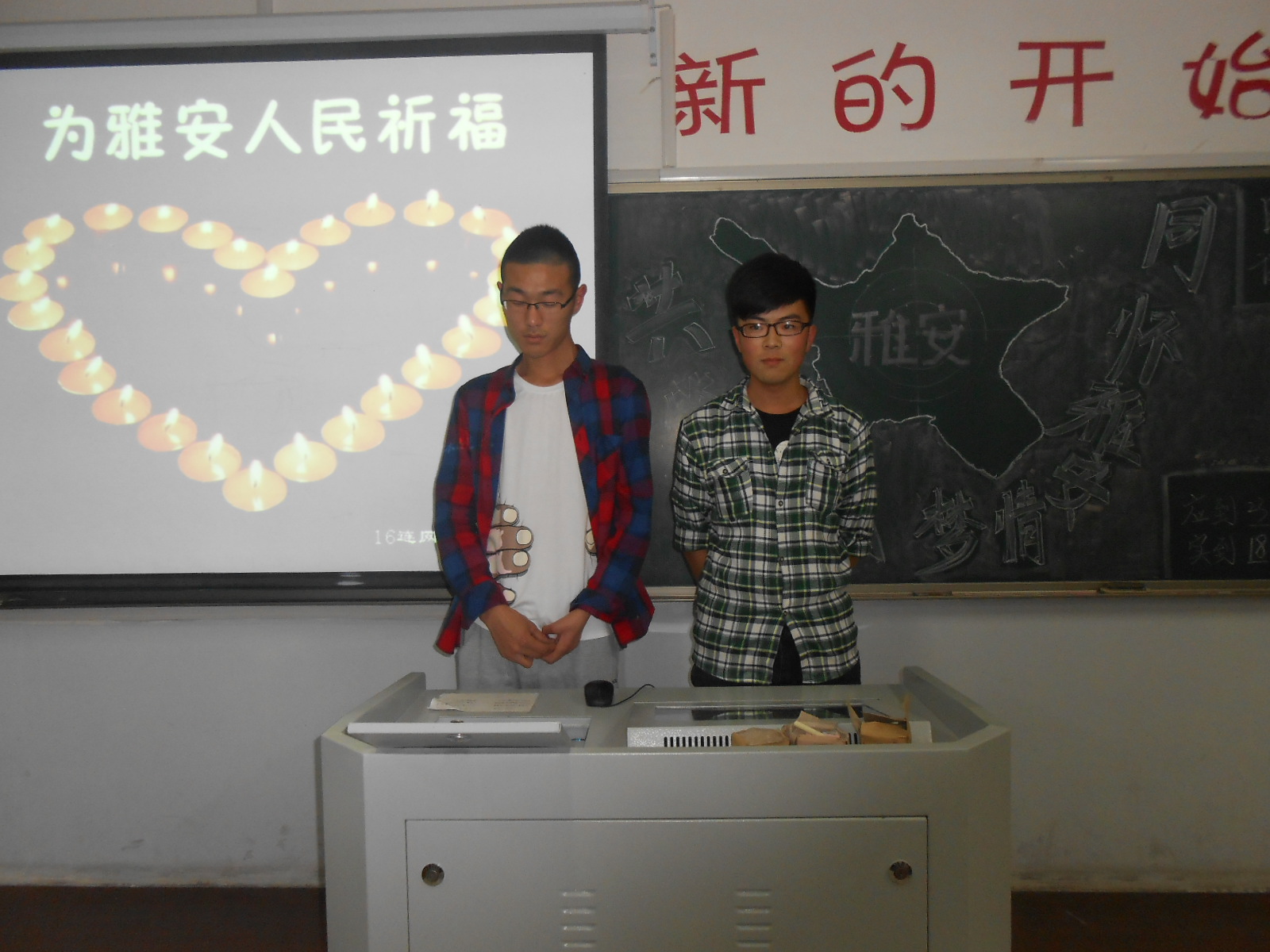 活动开办过程中,同学们通过各种形式为雅安地震中遇难的同胞们默哀祈福,虽然我们不能亲自到灾区,开展救助,但是同学们纷纷为雅安加油,为雅安人民祝福!数理学子的实际行动充分体现出了强烈的时代责任感和使命感,更是对中华民族一方有难八方支援,团结互助传统美德的良好传承。