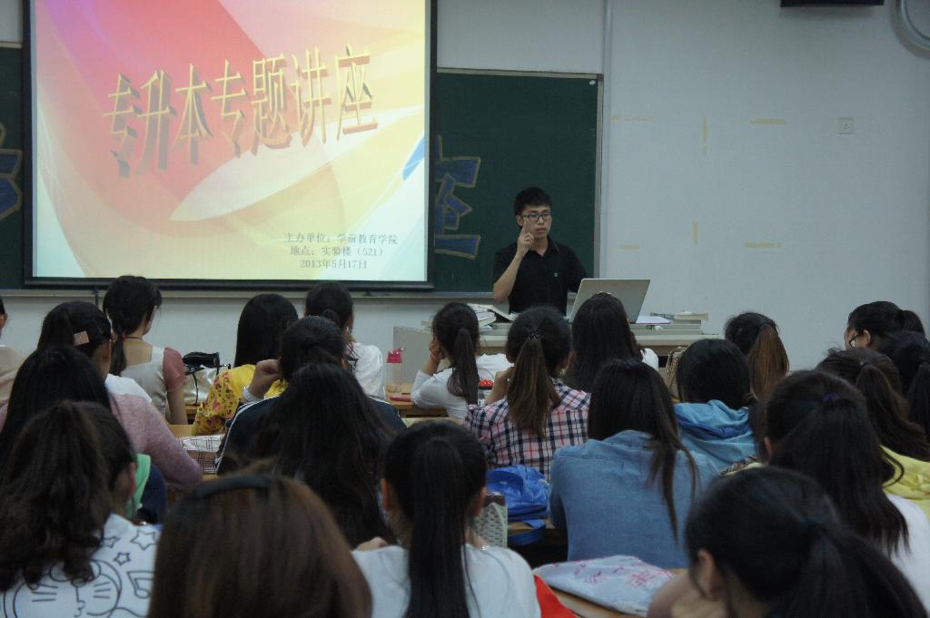 在2010级学生返校办理教师资格证之际,结合2011级准备专升本学生的需要,学前教育学院组织2010级参加过专升本的学生,于5月17日晚在科技楼521开展专升本指导交流会,200余名学生参加了交流。