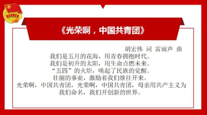 由团旗、齿轮、麦穗、初升的太阳、光芒以及写有“中国共青团”五字的绶带组成。它象征着共青团在党的思想光辉照耀下,团结各族青年,朝着党所指引的方向奋勇前进。