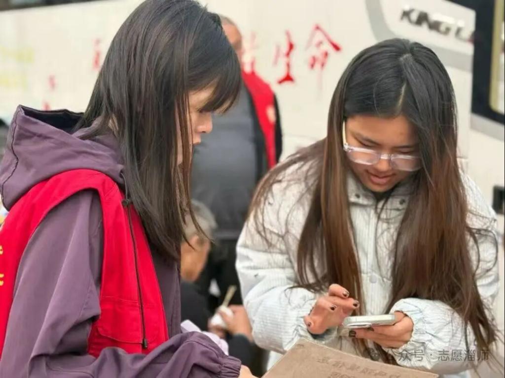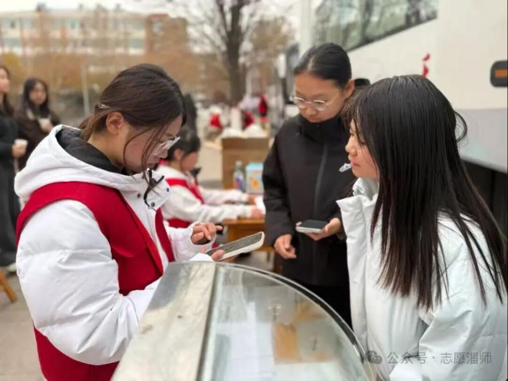 献血车上,工作人员服务周到、关怀贴心;车旁志愿者忙碌有序,用微笑与细致,为献血师生搭起暖心助力。