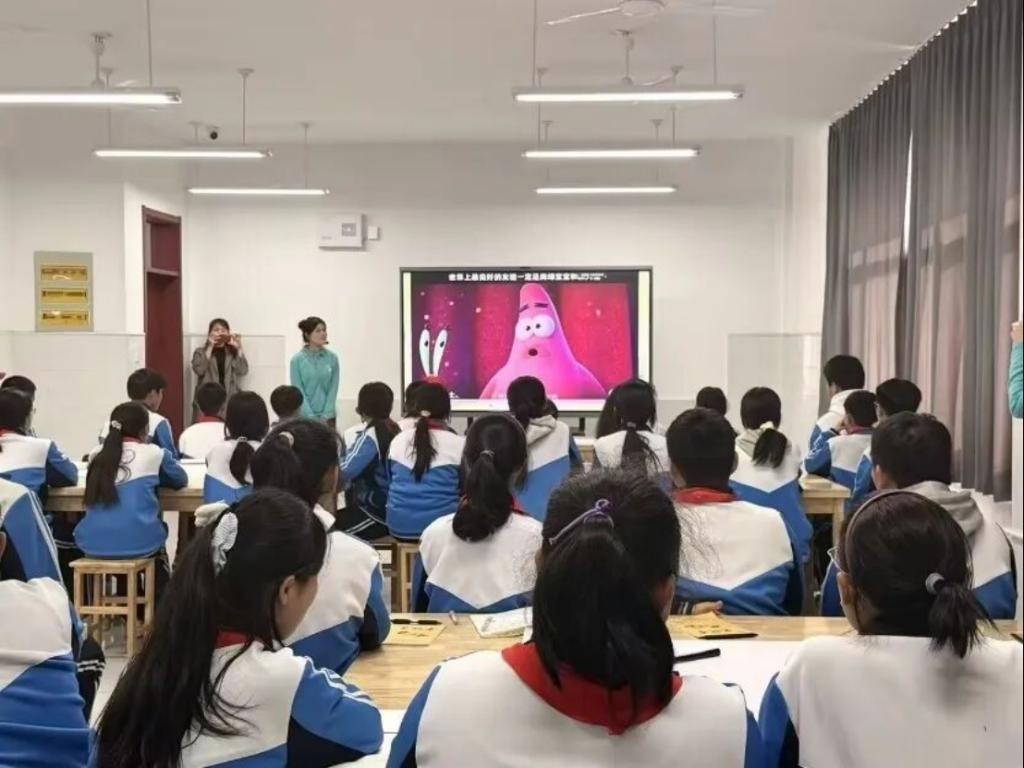 课堂以《海绵宝宝》动画片段轻松开场,志愿者抛出“与朋友的相处需求有差异怎么办”“如何维系友谊”等问题,引导学生分组讨论、分享观点。