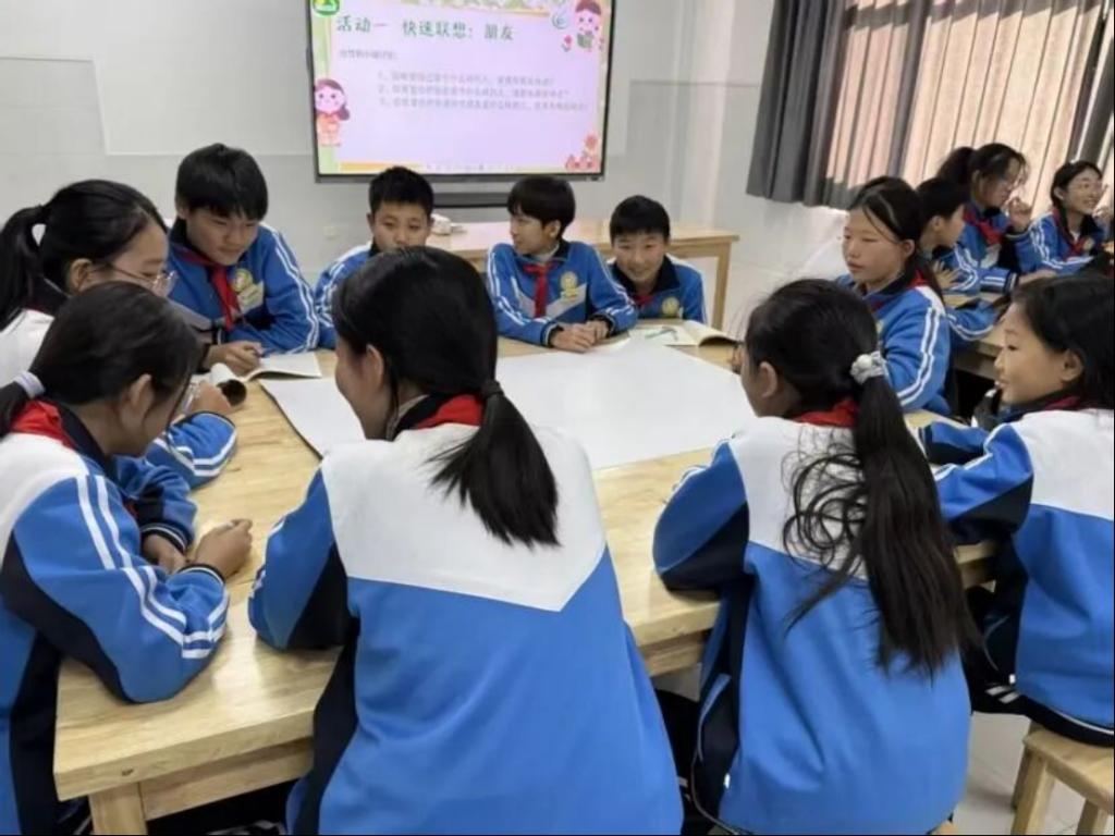 在“快速联想:朋友”互动环节,学生们在白纸上写下对“朋友”的期待,再通过小组展示总结出“真诚待人、关注感受、信任尊重”的交往核心,原本腼腆的学生也主动分享了自己的交友故事。